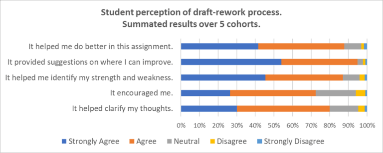 Students were randomly assigned to anonymous groups of three, each submitting an initial draft of a written assignment. Drafts were then exchanged within each group, requiring students to provide feedback to two peers and, in turn, receive feedback from two others. After considering peer and internal feedback, students revised and resubmitted their assignments, with final versions assessed by teaching assistants. Five cohorts of students (n=421) were surveyed for their perceptions of peer feedback received, and we examined how students improved their work from draft to final.