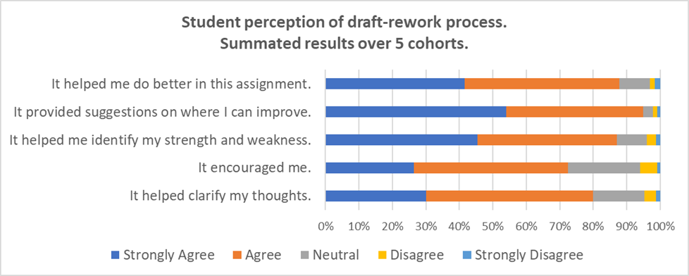 The results demonstrate that integrating a draft–rework design with peer feedback in large classes yields improvements in student learning outcomes. Students reported that both providing and receiving feedback, along with opportunities for self-regulation and co-regulation, contributed to their development of evaluative judgement and a deeper understanding of assignment criteria.