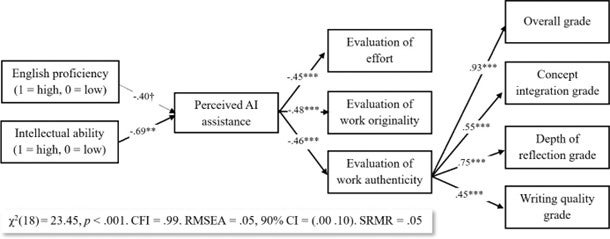 Participants in low intellectual ability conditions perceived more AI assistance (M = 5.36, SD = 1.10) than those in high ability conditions (M = 4.66, SD = 1.40), F (1, 116) = 9.24, p = .003. Path analysis (Figure 2) showed that higher perceived intellectual ability was linked to lower perceived AI assistance, which was negatively associated with effort, originality, and authenticity. Authenticity was positively associated with grades. Mediation analyses showed perceived AI assistance mediated the links between intellectual ability and effort (B = .24), originality (B = .24), and authenticity (B = .24). Authenticity mediated between perceived AI assistance and overall grade (B = -.43), reflection depth grade (B = -.40), and concept integration grade (B = -.26). Findings demonstrate that identical content can receive different evaluations based on student ability cues and perceived AI use, highlighting AI-related bias as a source of grading unfairness.