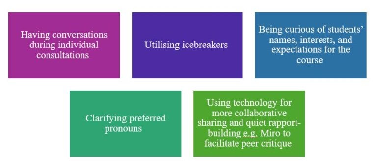 On Theme 2, LC members discussed rapport-building, defined as “an overall feeling between two people encompassing a mutual, trusting, and pro-social bond” (Frisby & Martin, 2010, p. 147), achieved through effective teaching behaviours (Frisby & Munoz, 2021). Our aims included: