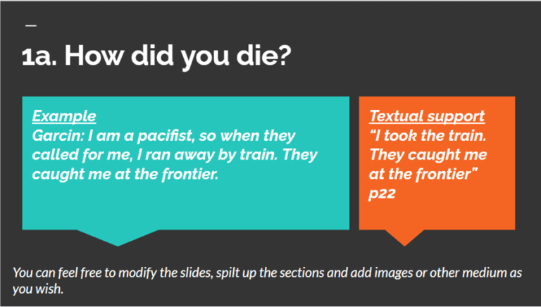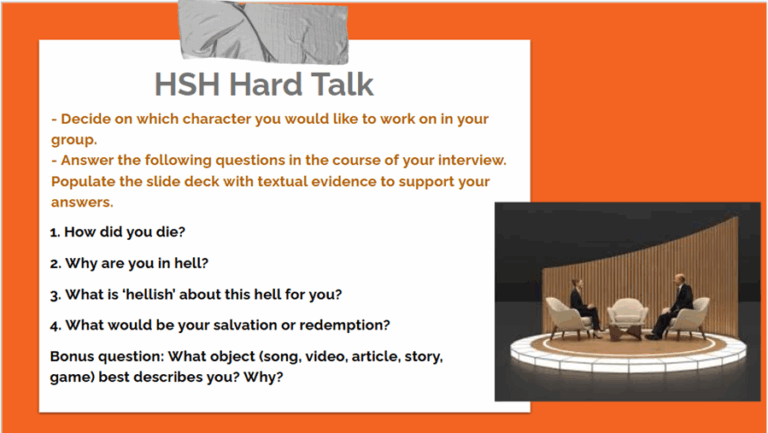 In groups of five, students are tasked with hosting a Talk Show. One student would take on the role of the host, to interview a key character in the play, enacted by another student. To deepen their engagement of the text, students are also tasked to incorporate and enact a significant “flashback” scene from the playscript into the Talk Show. To scaffold their learning, a slide template with suggested sample interview questions and pointers to consider in drafting the character’s answer is provided. Students are given time in class to discuss and work. The slides also serve as a backdrop for the Talk Show. (See Figures 1 and 2 below). For the group presenting, it works as a teleprompt; but for other groups listening, it is a visual aid that helps them follow and reflect on the discussion.