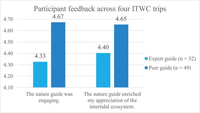 Figure 2 indicates that participants generally found the peer guide more engaging than the expert guide, with the difference in scores being statistically significant (p=0.001) with a one-tailed test. In addition, participants felt that the peer guide better enriched their appreciation of the intertidal ecosystem than the expert guide (p 0.002). Having a peer guide encouraged greater self-directed learning from the participants, as the peer guide’s “presence made the session feel more like an engaging sharing experience” and they “felt more comfortable asking questions, which deepened my understanding and encouraged open discussions”.