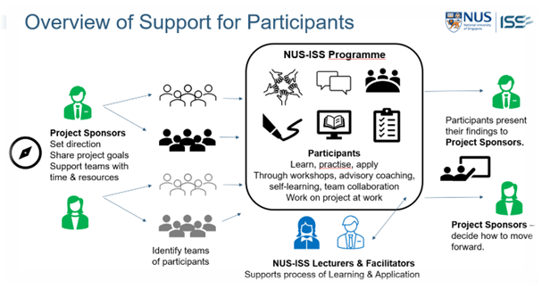 At the end of the programme, a Gallery Walk approach is used where each team showcases their discovery journey, learning and recommended solutions to their sponsors and stakeholders across agencies. Lecturers also designed a feedback mechanism where any of the invited guests can write comments and questions on post-it and paste it on the teams’ artefacts. This again provides cross-agency feedback and learning, which is both inspiring and highly motivating for the teams. Throughout the learning journey, learners are well supported (see Figure 2) and a high level of learning and application is achieved.