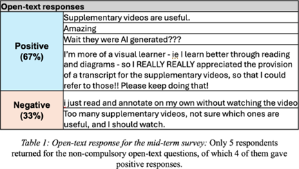 The findings from our student survey aligning with previous research (Chiu, 2023), support the feasibility of incorporating short, AI-assisted videos as a scalable, time-efficient supplement to traditional instruction. Despite positive feedback, a respondent found the number of supplemental videos overwhelming and struggled to identify the most relevant ones within the limited semester timeframe. Other than positive feedback, there was a comment on the overwhelming number of videos and uncertainty about which were relevant. This suggests a need for better organization of the videos, such as grouping by difficulty or linking to specific learning objectives. One student preferred a transcript due to his/her visual learning style. While transcripts could improve accessibility, they might reduce video engagement and risk spoon-feeding students, especially in an open-book course like LSM2233. Future improvements should aim to balance content delivery with diverse learning preferences.
